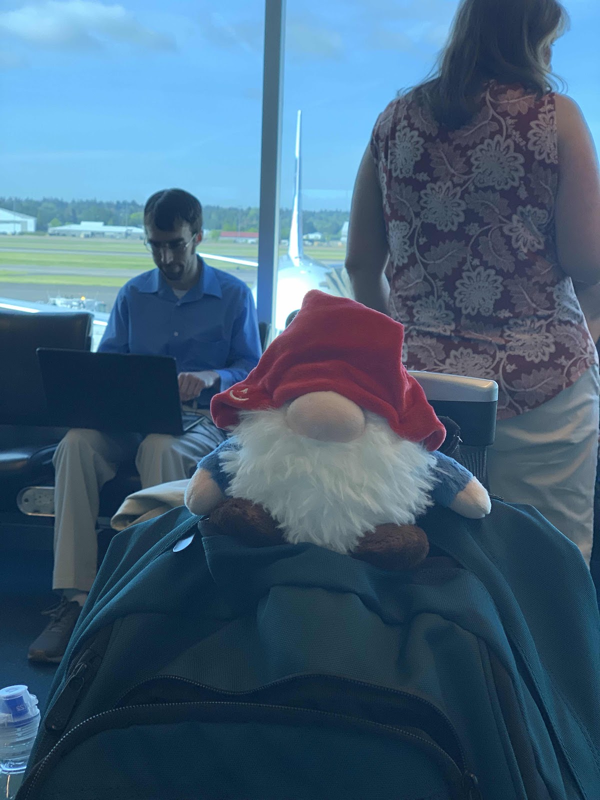 We’re all listening intently to our stewardess’s instructions while we push back, and Tomte has found his spot for the next few hours.