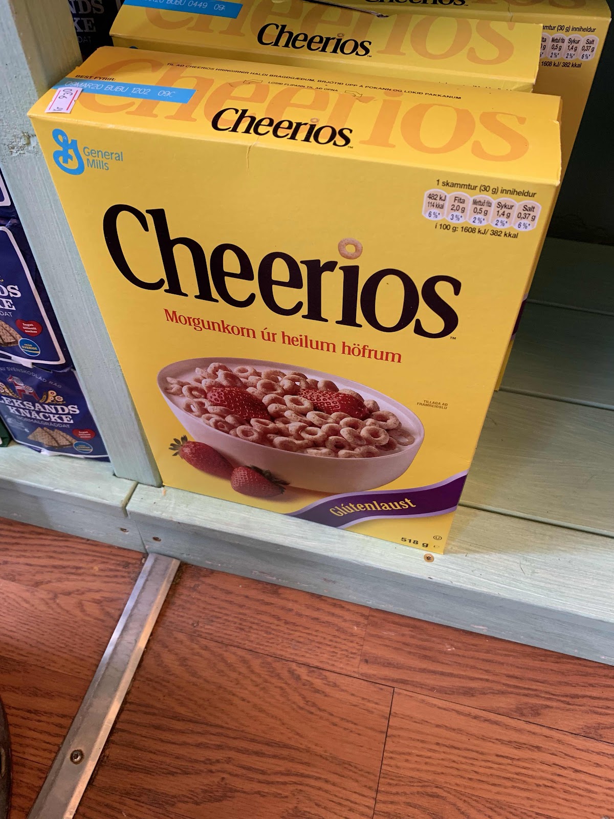So...bathrooms in this area are pretty hard to come by. At one point, George goes behind a big rock. I have to wait. In one of the 4 fjords, we stop in a small village for a break, and have a dessert so we can take advantage of their facilities. They had a little store, so I checked out some prices. This is probably a 24 oz box of Cheerios...for about $7.50 US.