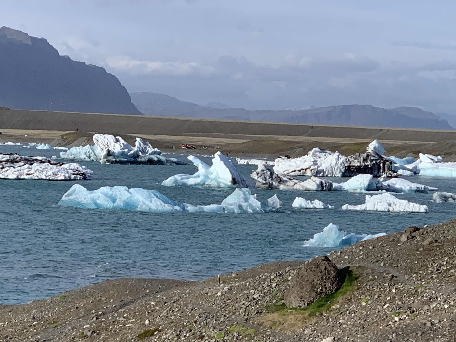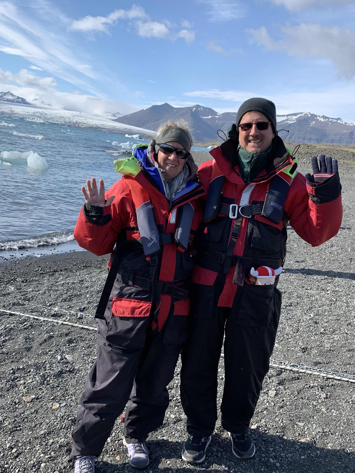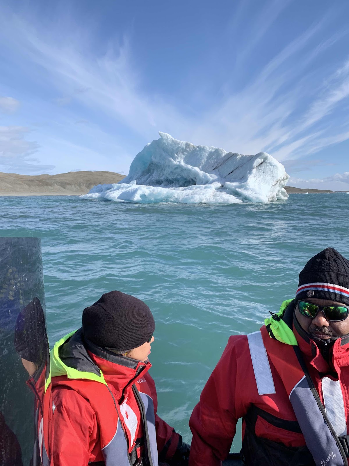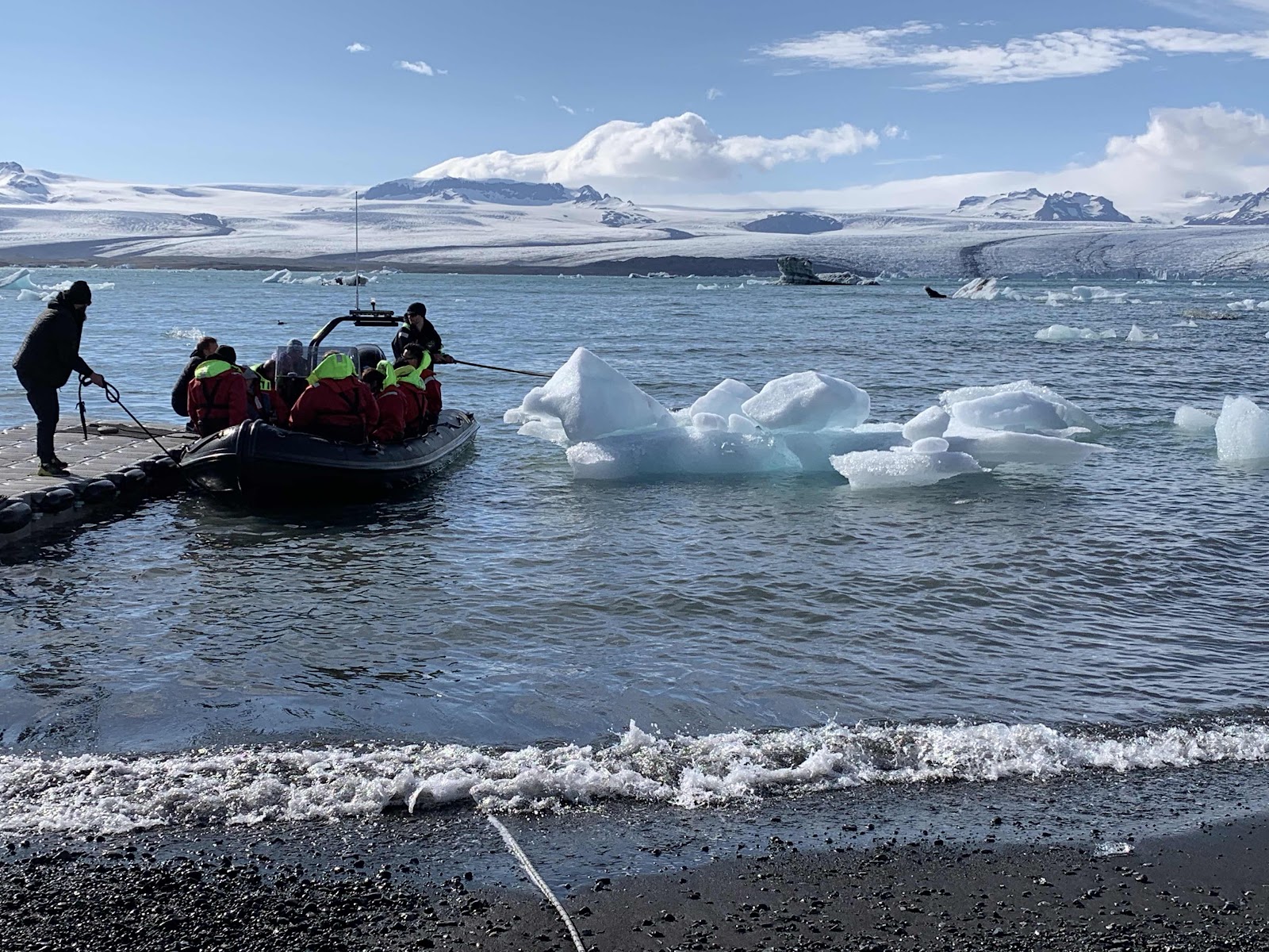So now, suited up, 10 of us climb into this inflatable from a floating dock that is pitching on the wavy water! They have to hold the iceburgs away, as the dock is on the downwind side of the lake from the glacier!