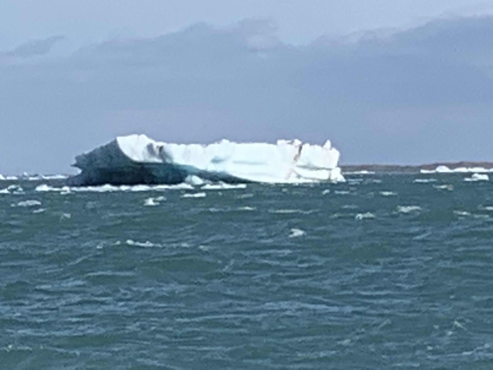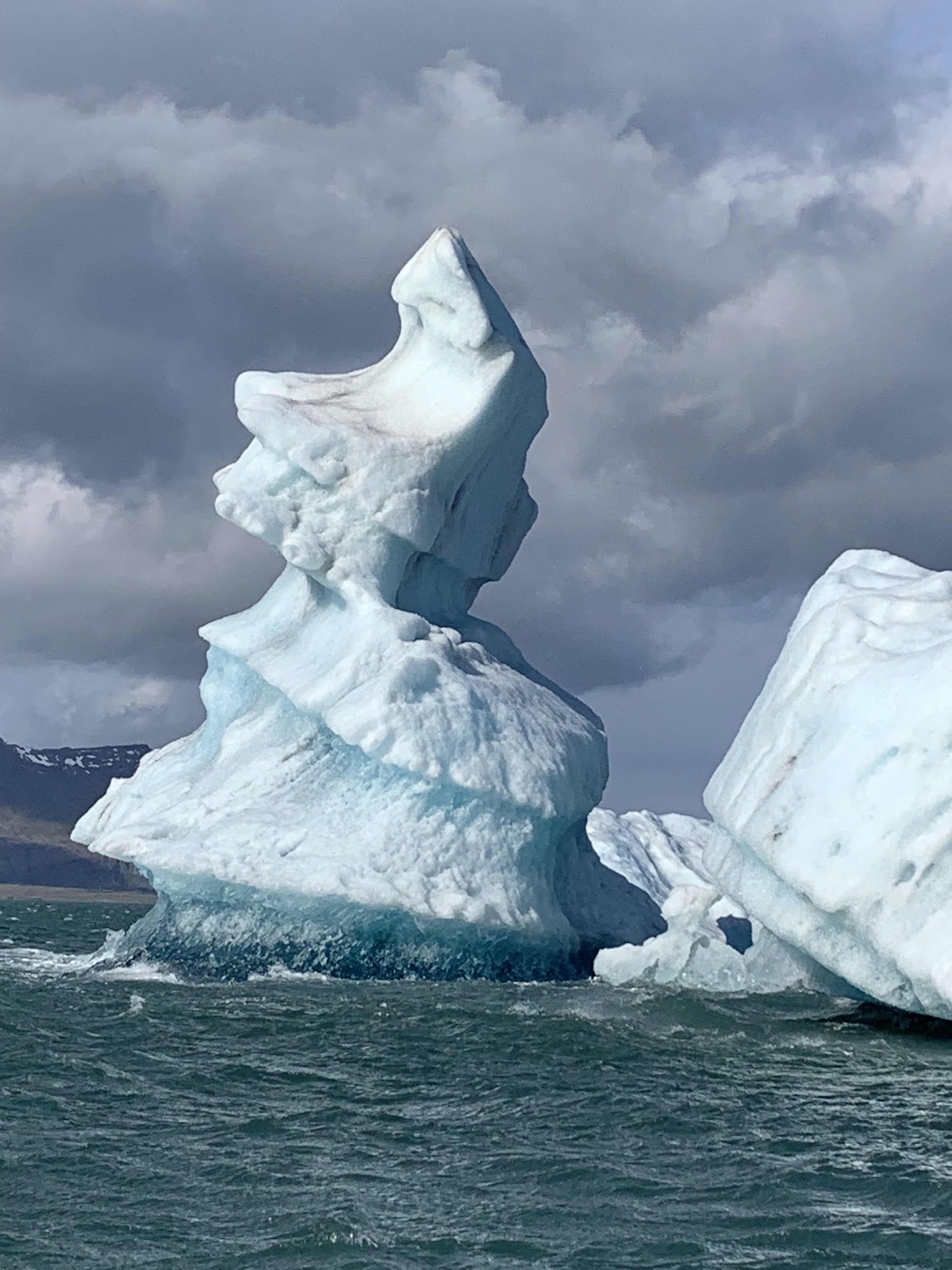 These clear blue ones were the ones our guide got the most excited about. The advantage to these windy days is that a burg sometimes flips over. It’s then solid ice, before the surface starts melting. After a few hours, the top texture is more like a slushy. A big burg melts in a week or so in the 4 celsius salt water. I can attest to the salt...We in the front of the boat got a few waves in the face!